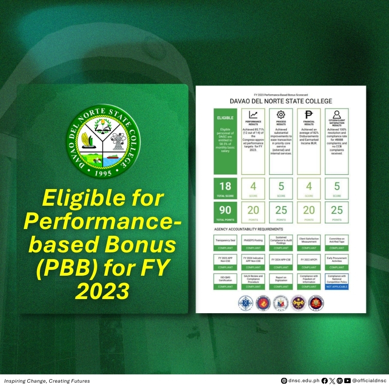 PANABO CITY – Davao del Norte State College (DNSC) has been declared eligible for the Fiscal Year (FY) 2023 Performance-Based Bonus (PBB) after the approval of its appeal