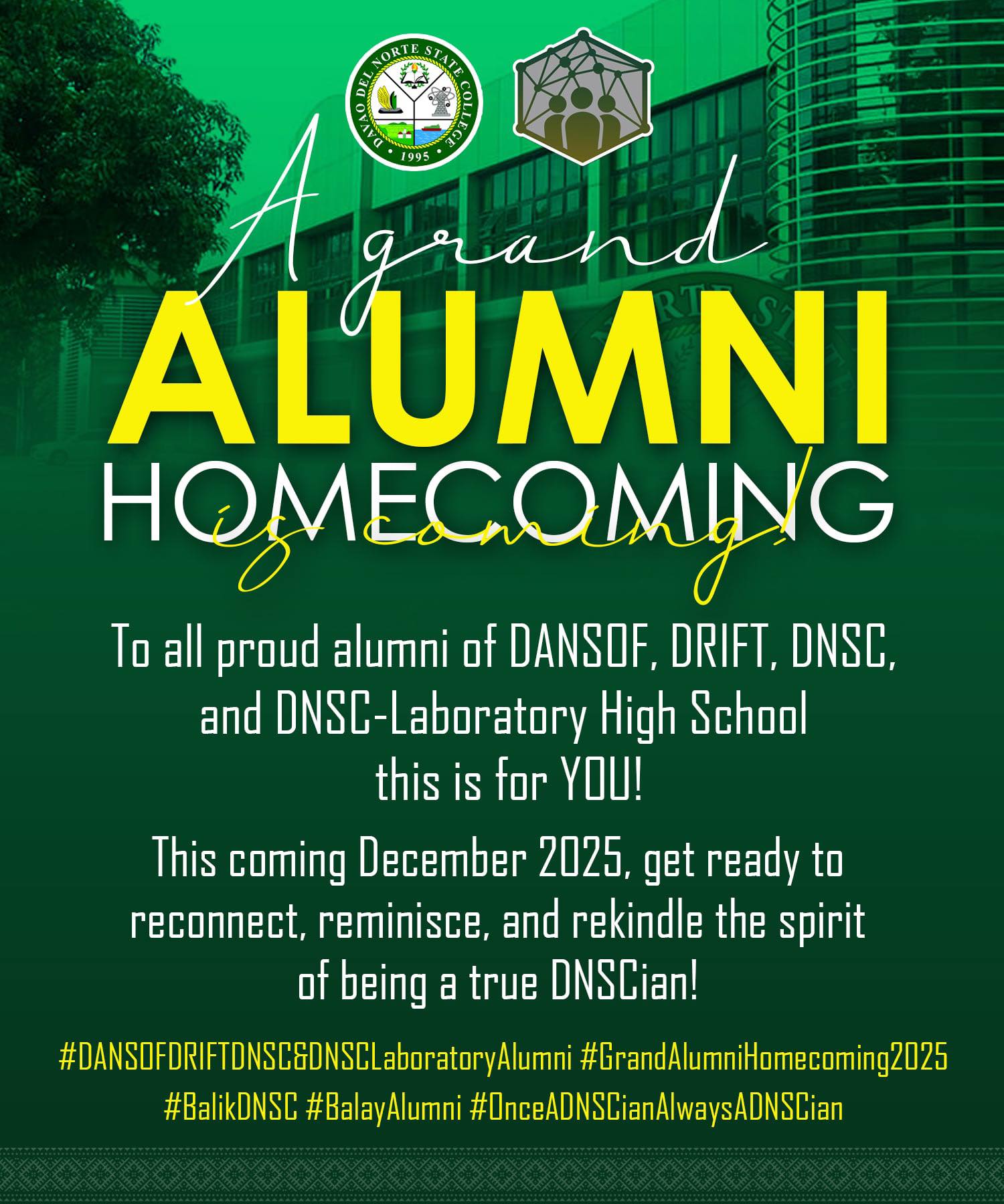 Get ready to reconnect, reminisce, and rekindle the spirit of being a true DNSCian! A Grand Alumni Homecoming is in the works—and we want YOU to be part of this once-in-a-lifetime gathering!
