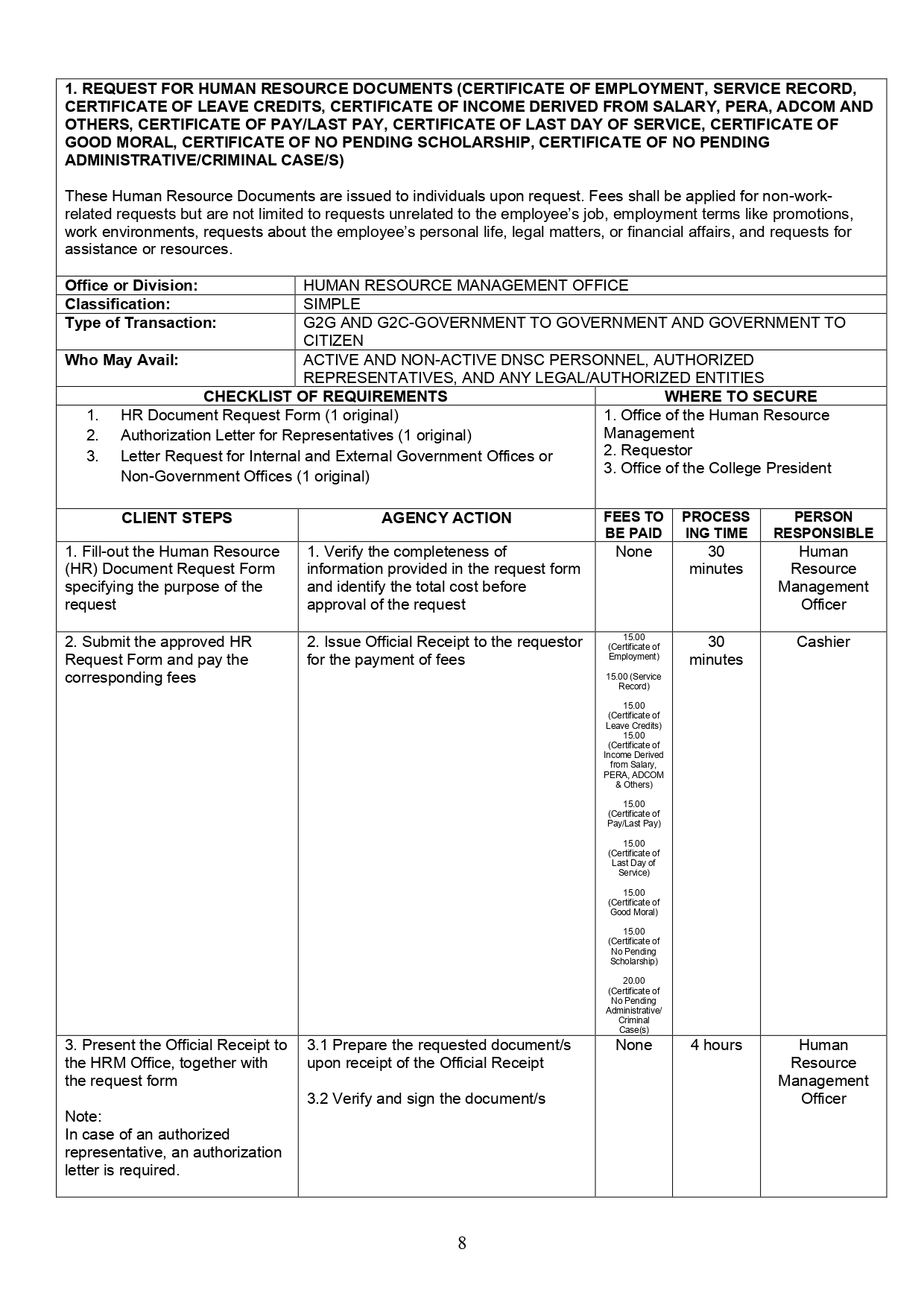 REQUEST FOR HUMAN RESOURCE DOCUMENTS (CERTIFICATE OF EMPLOYMENT, SERVICE RECORD, CERTIFICATE OF LEAVE CREDITS, CERTIFICATE OF INCOME DERIVED FROM SALARY, PERA, ADCOM AND OTHERS, CERTIFICATE OF PAY/LAST PAY, CERTIFICATE OF LAST DAY OF SERVICE, CERTIFICATE OF GOOD MORAL, CERTIFICATE OF NO PENDING SCHOLARSHIP, CERTIFICATE OF NO PENDING ADMINISTRATIVE/CRIMINAL CASE/S)