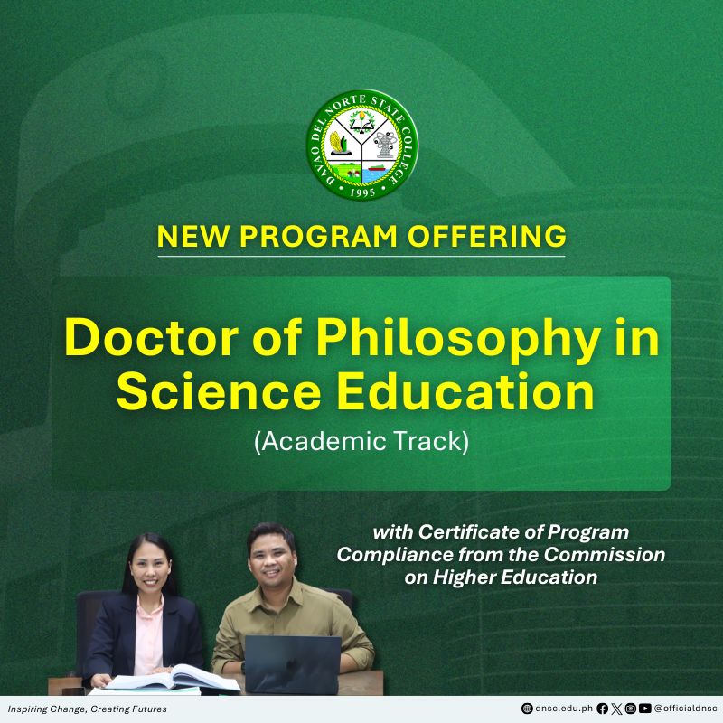 PANABO CITY – The Commission on Higher Education (CHED) has issued the Certificate of Program Compliance (COPC) to the Doctor of Philosophy in English Language Studies and Teaching (PhD ELST) and Doctor of Philosophy in Science Education (PhD SciEd) programs of Davao del Norte State College (DNSC), under its Institute of Advanced Studies.