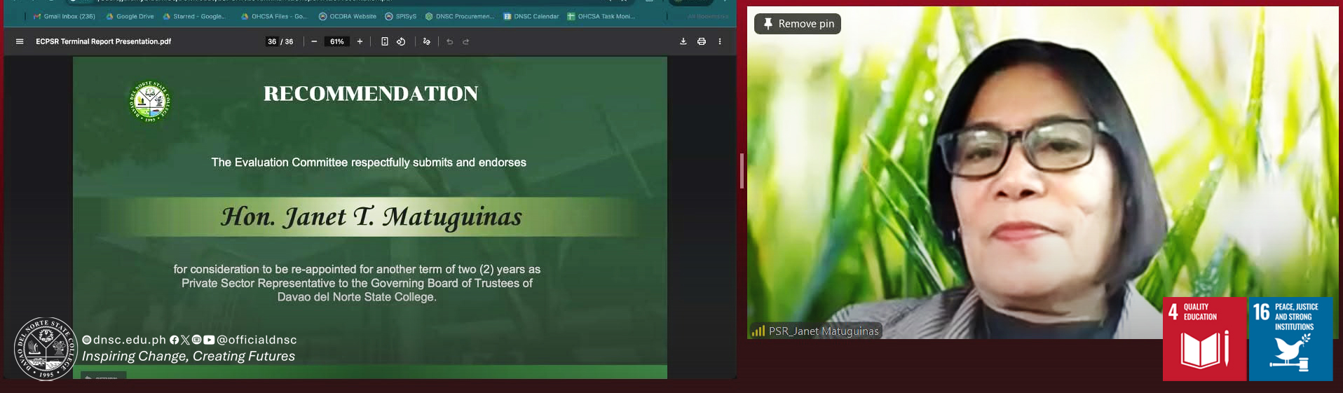 In-person attendees included BOT Vice-Chairperson Hon. Joy M. Sorrosa, DNSC SUC President III, and Hon. Samuel A. Plando, Faculty Trustee. Virtual participants included representatives of Hon. Loren Legarda, Chairperson of the Senate Committee on Higher, Technical, and Vocational Education, led by Hon. Kristoper Lanorias. Also present were Hon. Anthony C. Sales, Regional Director, Department of Science and Technology XI; Hon. Priscilla R. Sonido, Regional Director, Department of Economy, Planning, and Development XI; Hon. Juris D. Perez, Private Sector Representative; Hon. Glenne A. Lagura, Alumni Representative; and Hon. Rodney Jhon C. Gonzales, Student Representative.