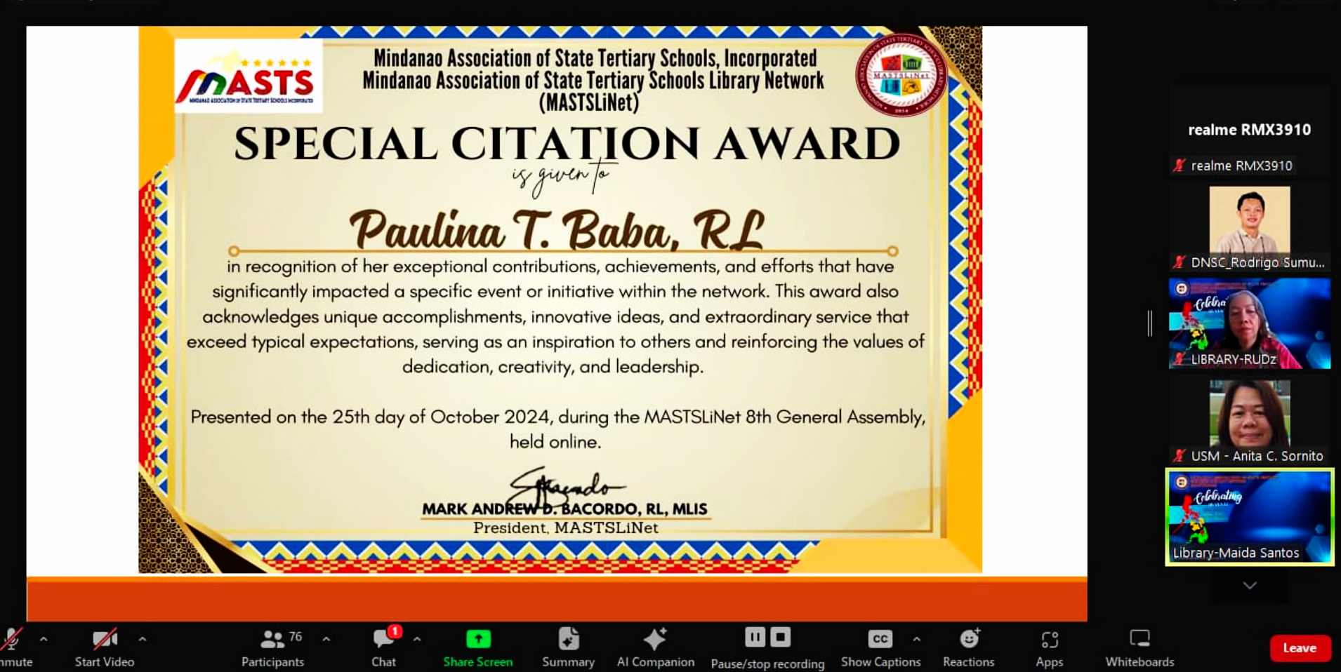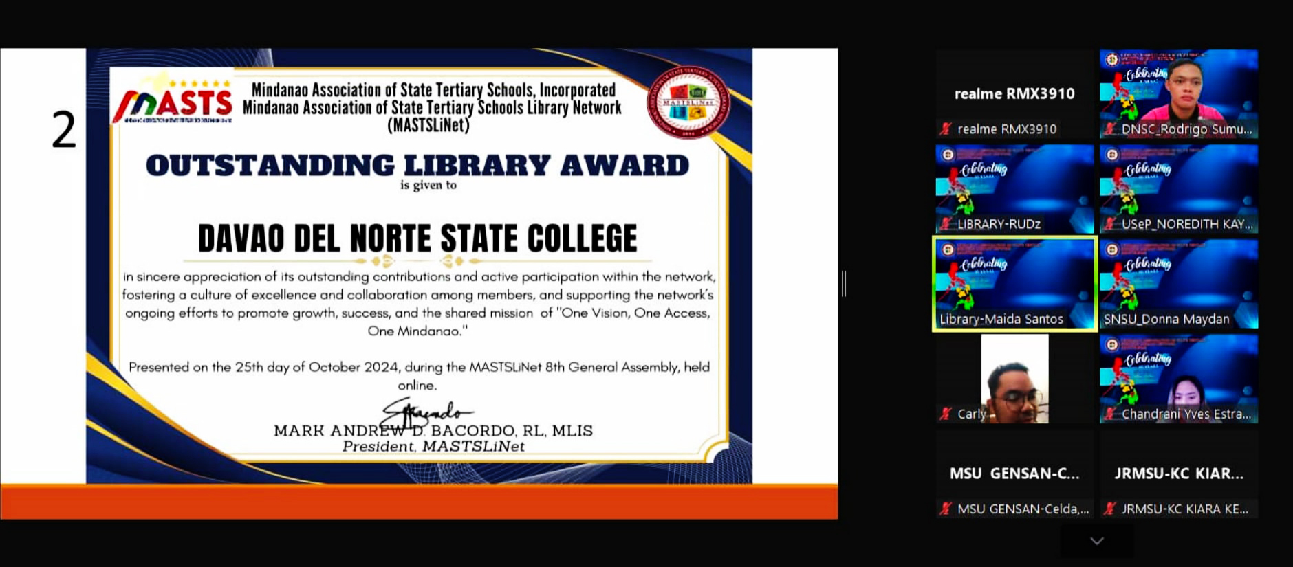 These awards were presented on October 25, 2024, via Zoom, during the MASTSLiNet 8th General Assembly and the network’s decade of celebration. These achievements underscore DNS
