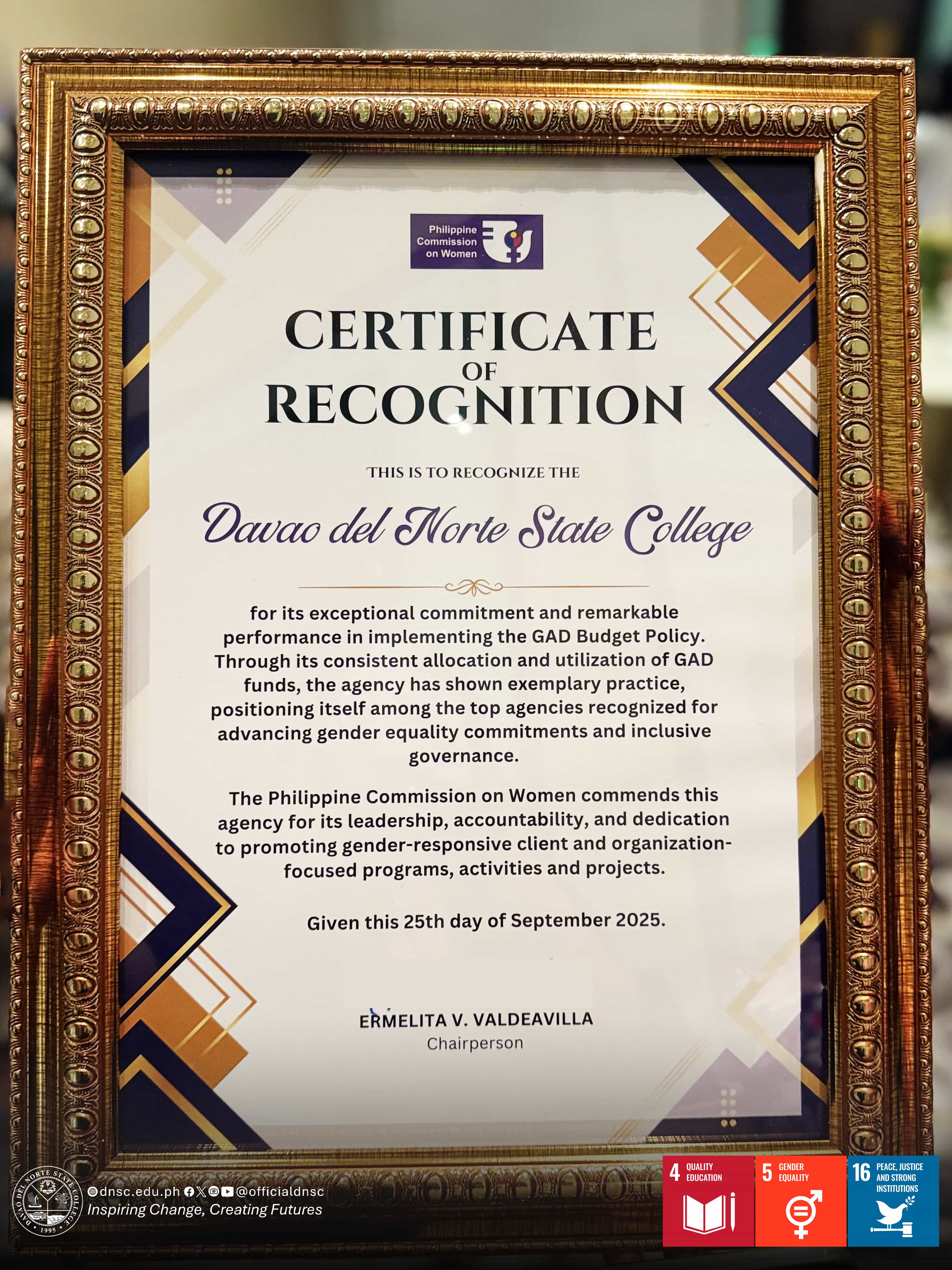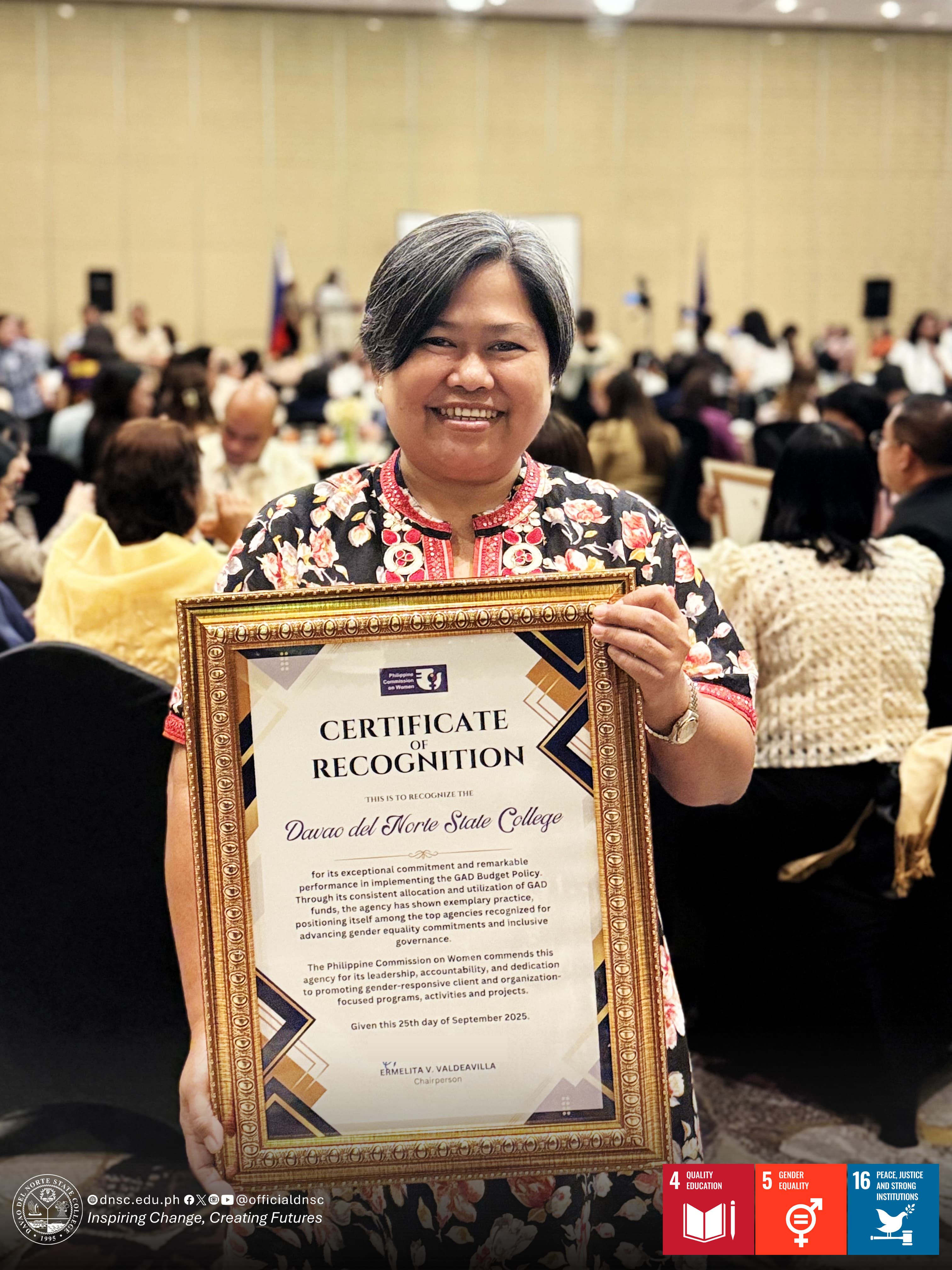 On September 25, 2025, the Philippine Commission on Women (PCW) conferred recognition to DNSC for its exceptional commitment in allocating and utilizing its 2024 Gender and Development (GAD) Budget, in line with national GAD Budget Policy guidelines. The awarding ceremony was held in Manila and gathered institutions demonstrating strong performance in gender-responsive governance.