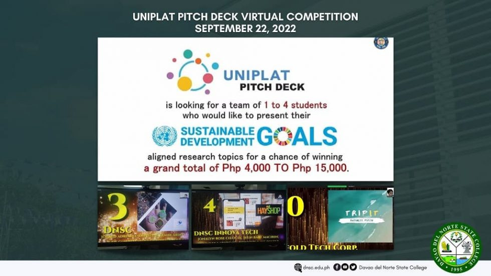 PANABO CITY – Three teams from Davao del Norte State College made it to the Top Ten of UNIPLAT Pitch Deck, a nationwide research and business competition that encourages and supports change-makers and young entrepreneurs. The competition was open to all higher education institutions (HEIs) and the judges were company executives and Sustainable Development Goals (SDGs) experts from around the world. The announcement of winners was made last September 22, 2022 via Zoom.