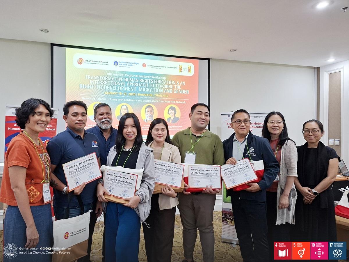 PANABO CITY – Davao del Norte State College (DNSC) sent faculty member Sunshine D. Enaguas to the 9th Annual Regional Lecturer Workshop on August 18–21, 2025, at the Mandarin Hotel in Bangkok, Thailand. The international gathering convened 20 educators from across the Association of Southeast Asian Nations (ASEAN) to exchange ideas, sharpen teaching practices, and deepen understanding of the complex intersections of human rights, gender, and migration.