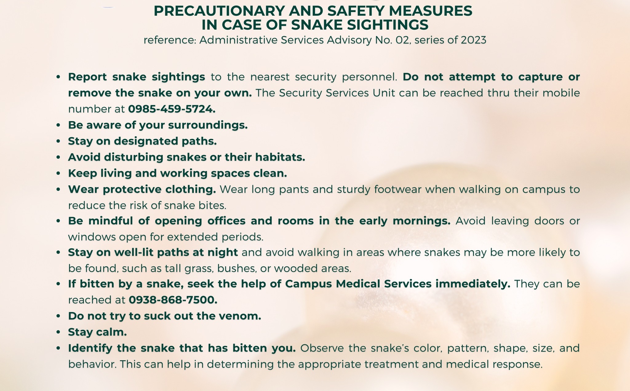 Please observe the safety precautions detailed in Administrative Services Advisory No. 02 - Campus Public Awareness and Safety on Snake Sightings.