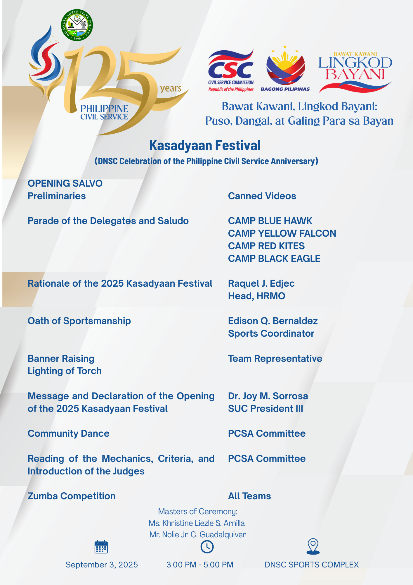 Link for Opening Program -Launching of DNSC Kasadyaan Festival 2025 -Parade of Teams -2-Minute Saludo -Lighting of Torch -Banner Raising -Zumba |