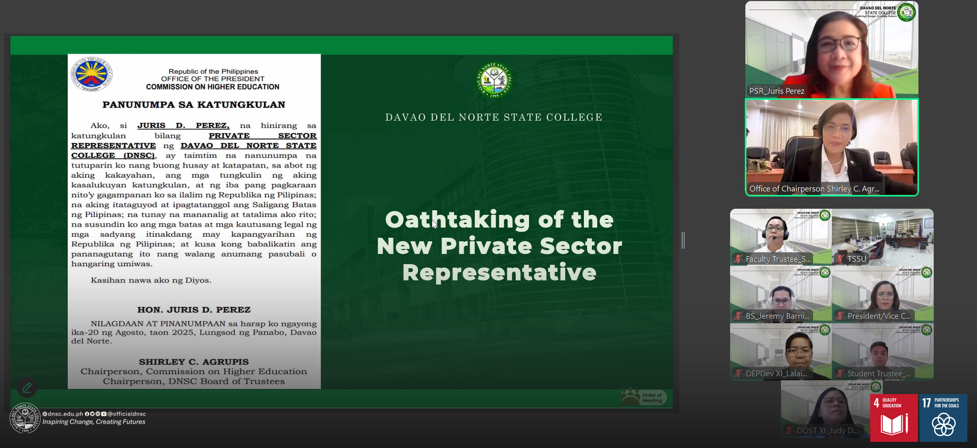 PANABO CITY – The Davao del Norte State College (DNSC) welcomed its new Private Sector Representative, Hon. Juris D. Perez, during the institution’s 2nd Quarter Regular Board of Trustees (BOT) Meeting held virtually on August 20, 2025. The oath-taking was presided over by Dr. Shirley C. Agrupis, Chair of the Commission on Higher Education (CHED) […]
