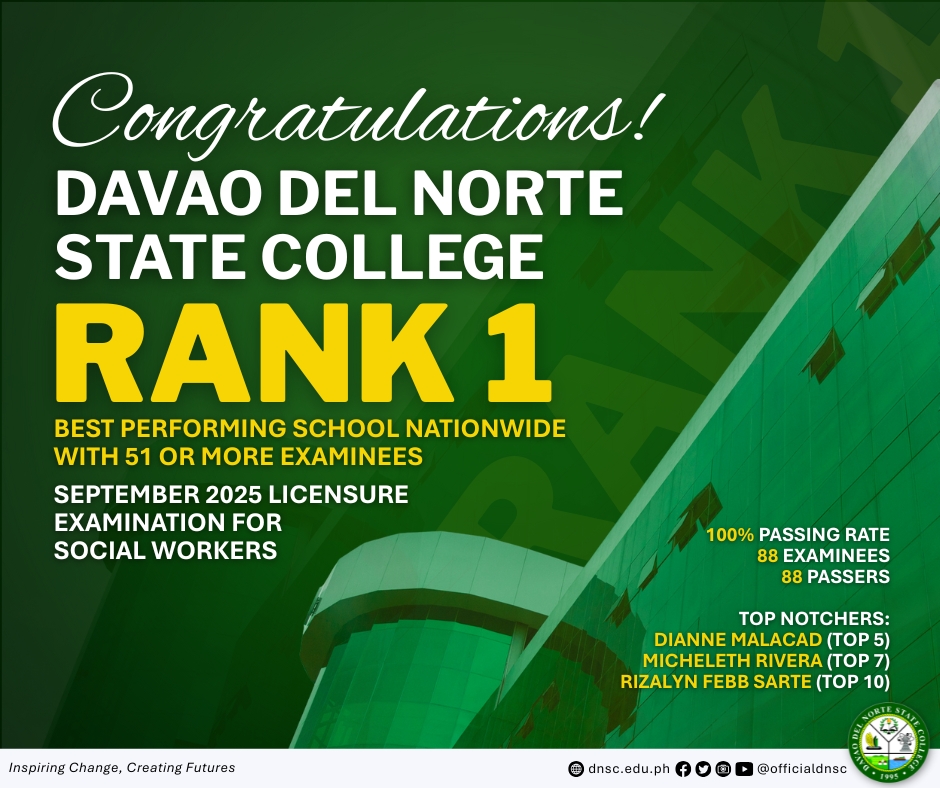 Panabo City – Davao del Norte State College (DNSC) once again achieved an extraordinary milestone as its Bachelor of Science in Social Work (BSSW) program delivered a 100% passing rate in the 2025 Social Work Licensure Examination (SWLE), as released by the Professional Regulation Commission (PRC) today, September 16, 2025. With all 88 examinees passing […]