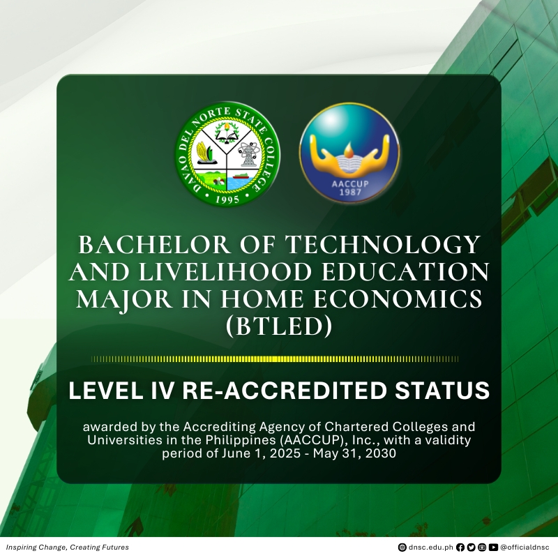PANABO CITY — Davao del Norte State College continues to strengthen the quality of its academic programs as ten of its degree offerings received updated accreditation status from the Accrediting Agency of Chartered Colleges and Universities in the Philippines (AACCUP), Inc. The Bachelor of Technology and Livelihood Education major in Home Economics (BTLED) achieved Level […]