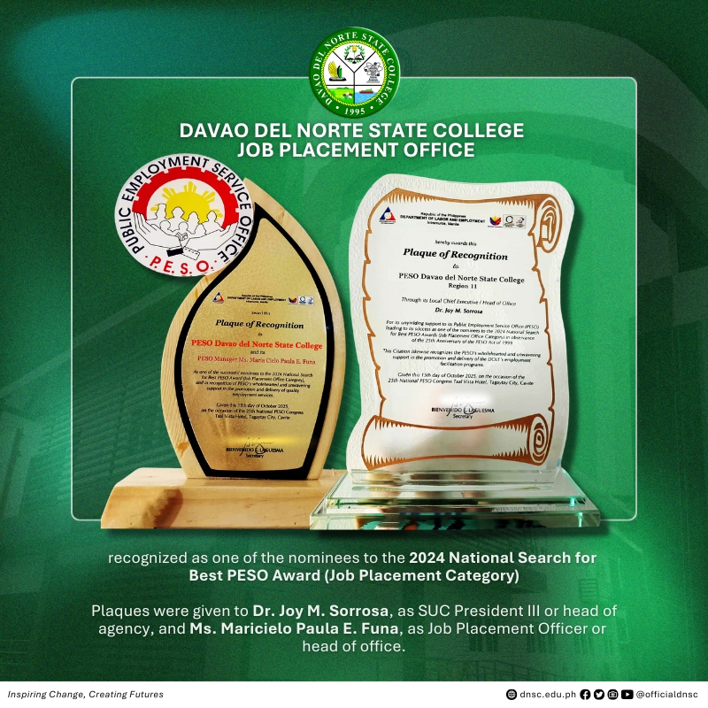 PANABO CITY — Davao del Norte State College’s Job Placement Office (DNSC-JPO) was recognized by the Department of Labor and Employment (DOLE) and the Public Employment Service Office (PESO) as one of the nominees for the 2024 National Search for Best PESO Award under the Job Placement Office (JPO) Category. The recognition was conferred during […]